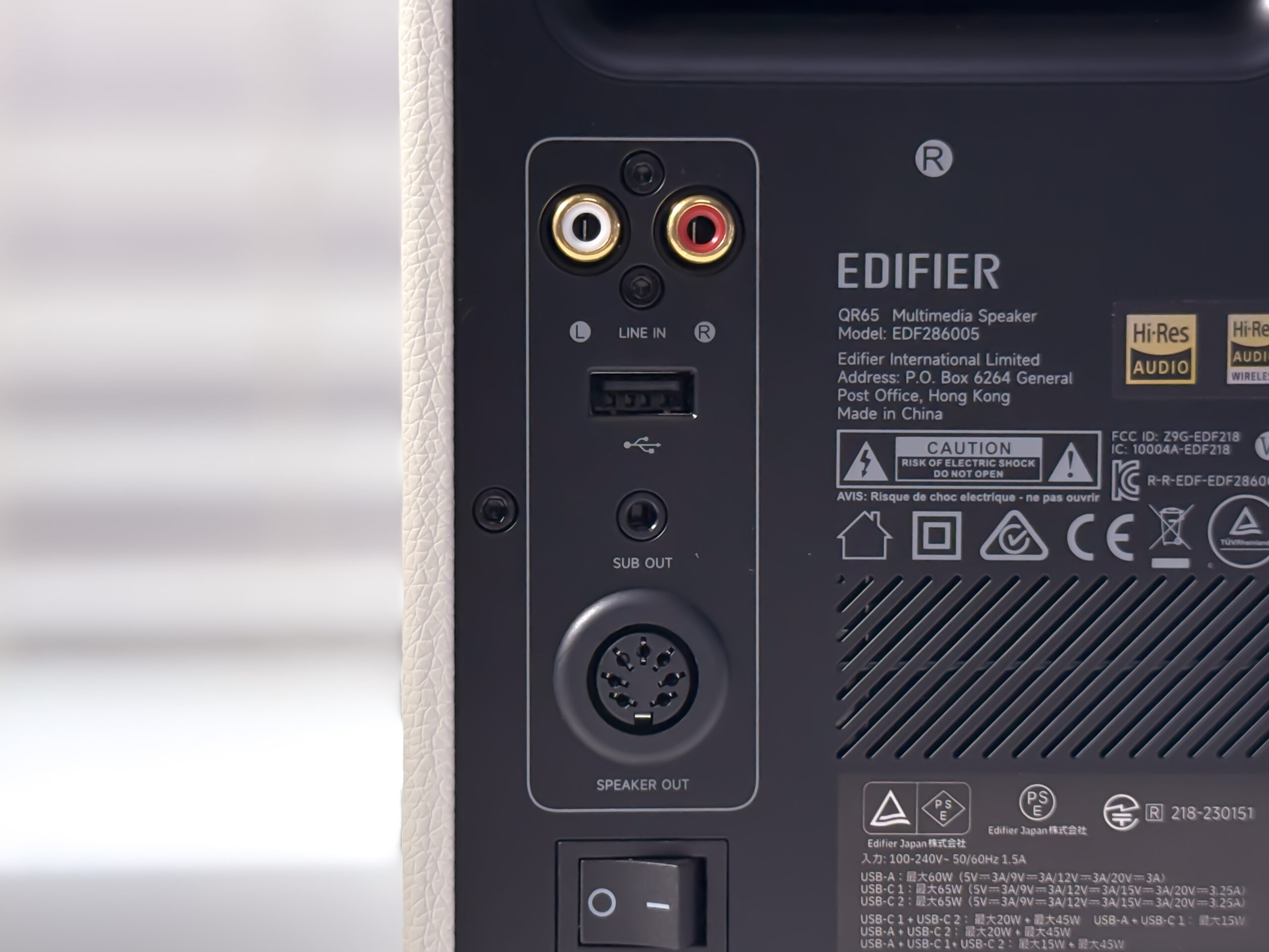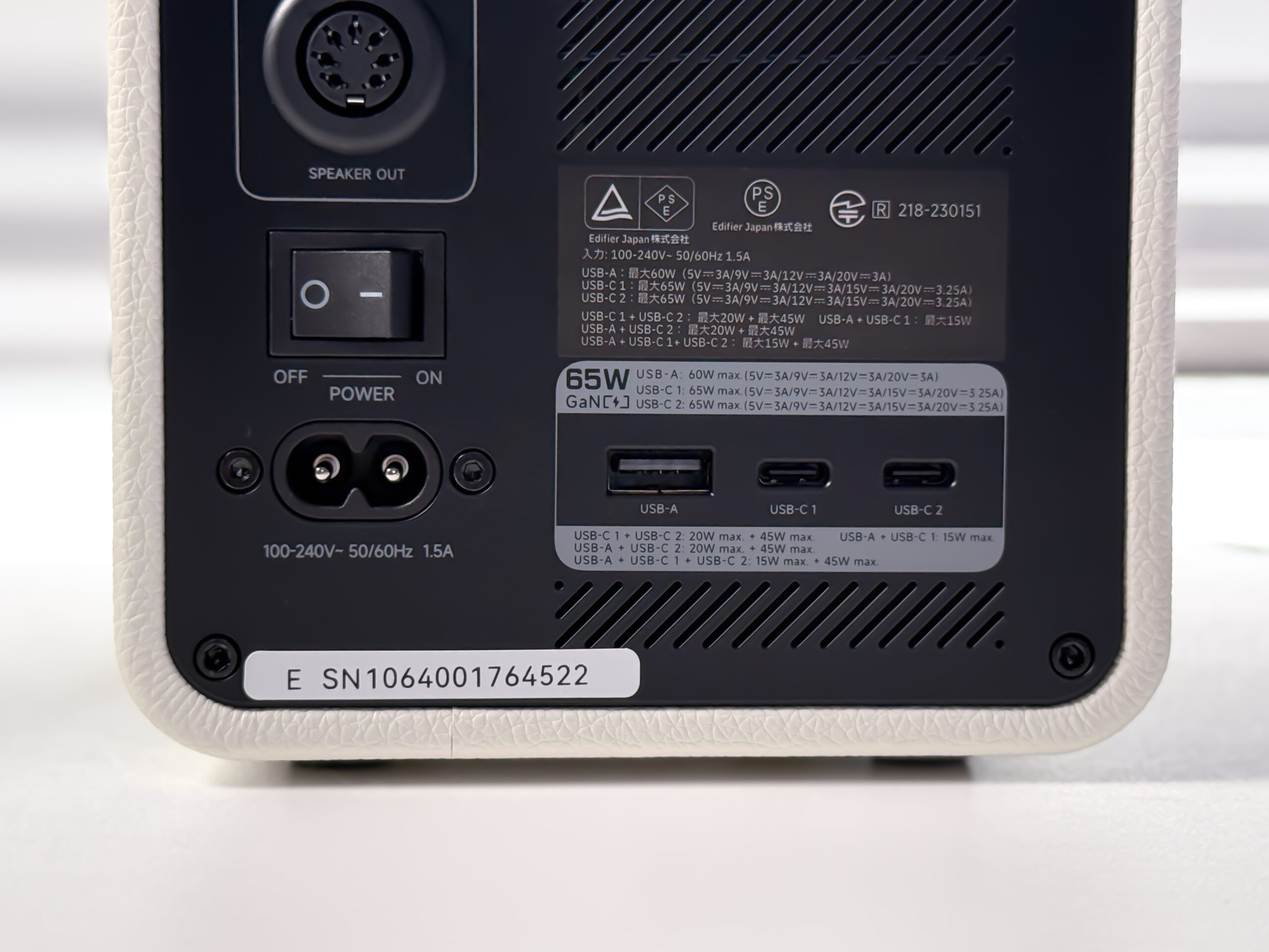 スピーカー背面には、電源ボタン、各種端子類、65Wの急速充電ポートが搭載されています。