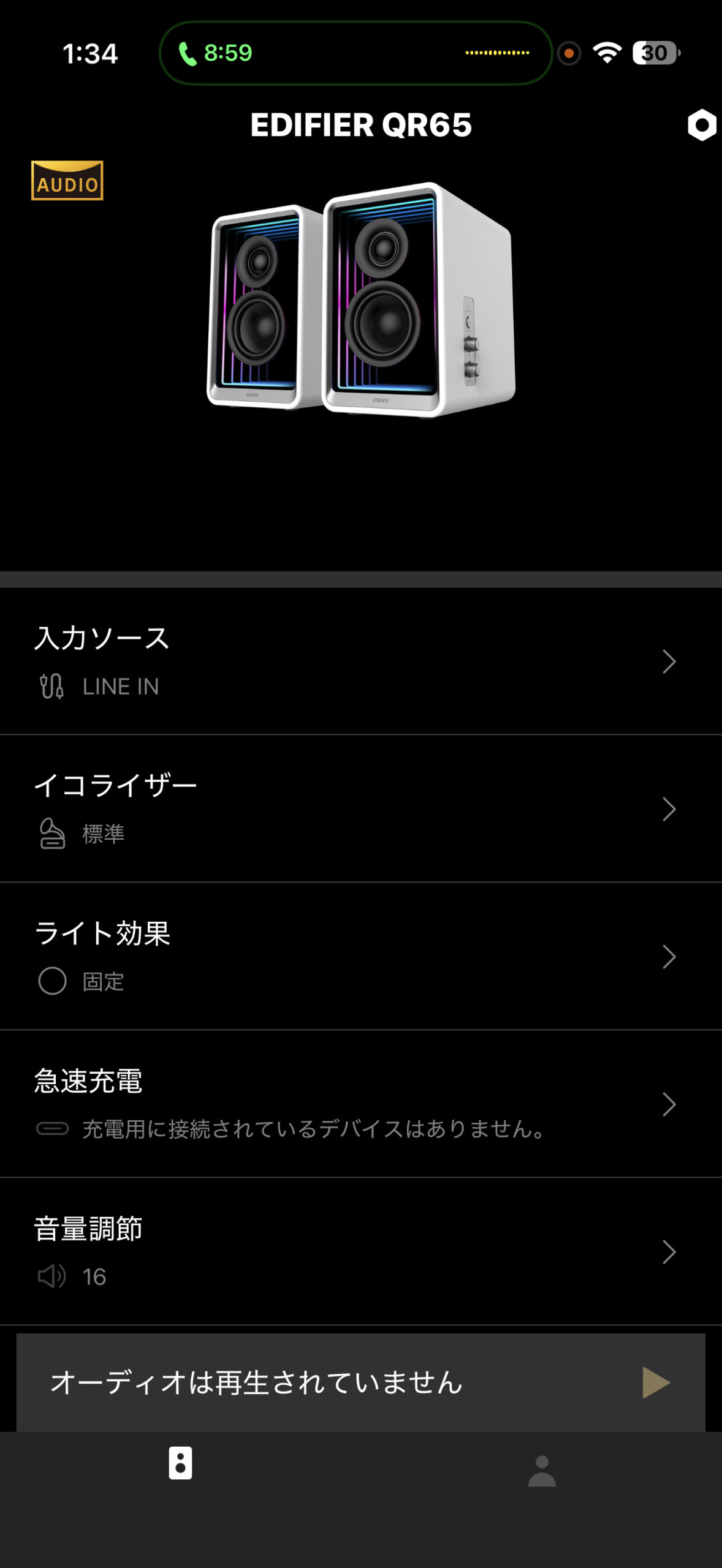 専用アプリでは音量調節の他に、入力ソースの切り替え、イコライザーの設定、ライト効果の変更、急速充電の管理などができます。