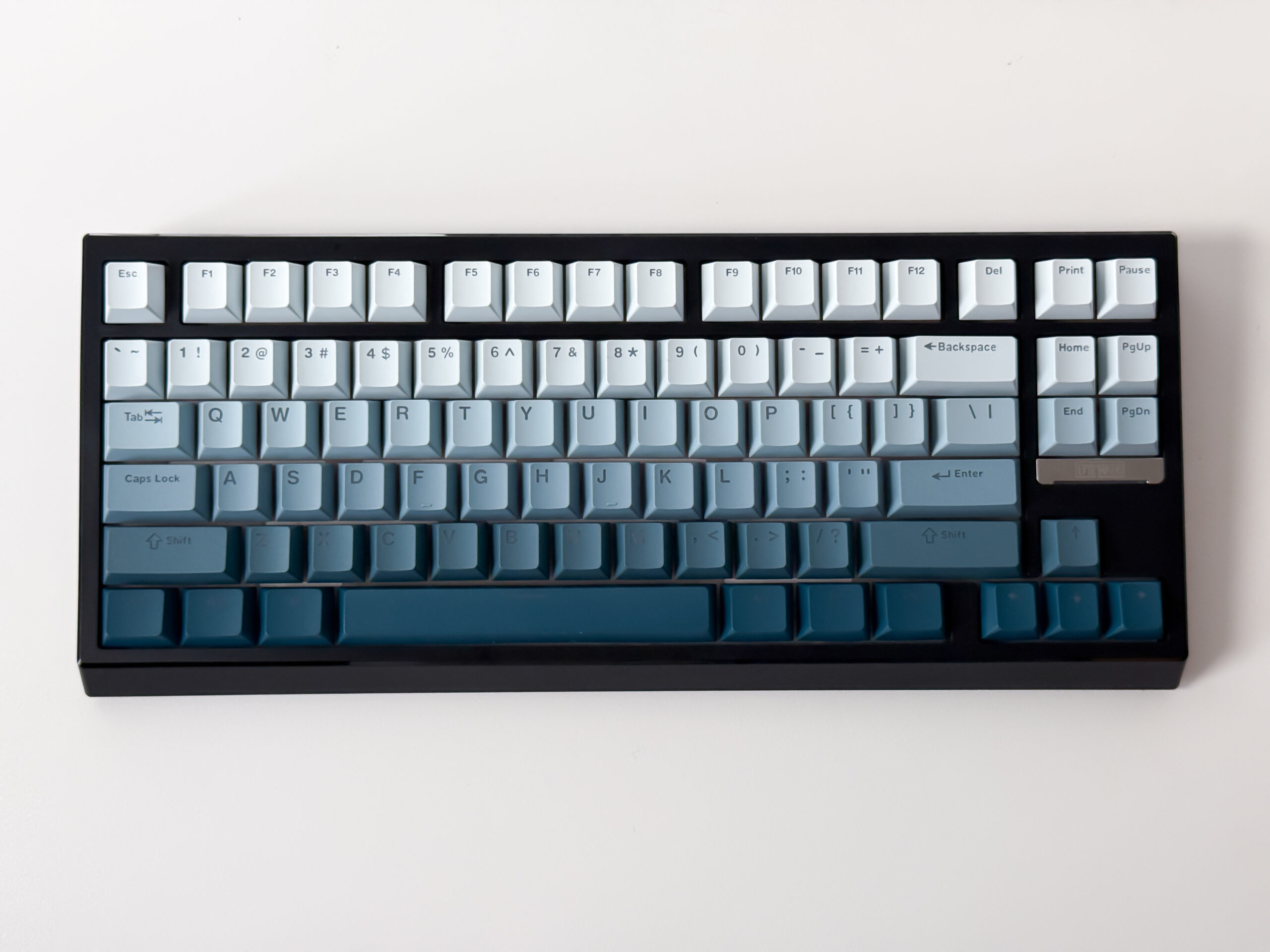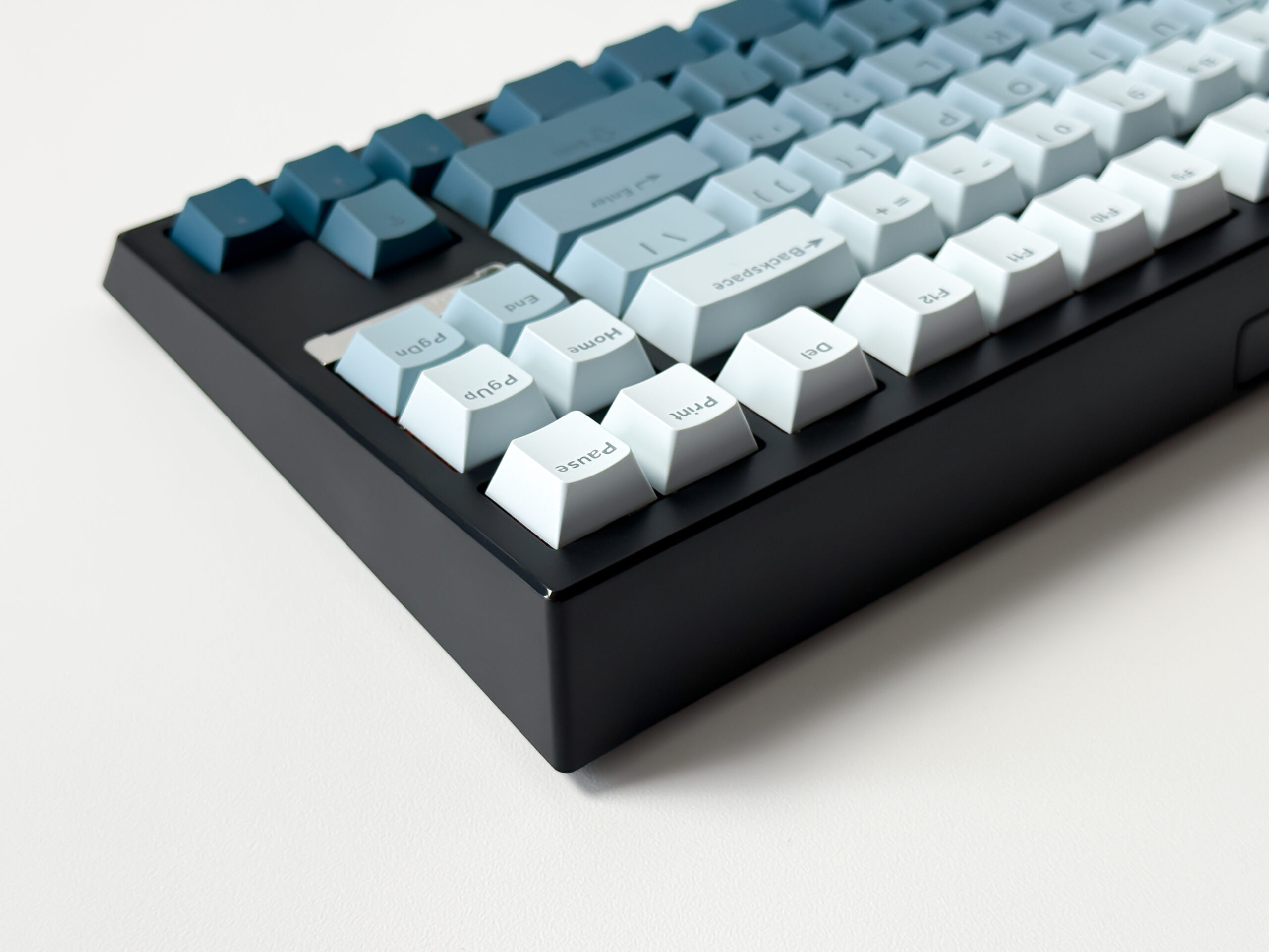 EPOMAKER G84HEは、US配列の75%ワイヤレスキーボードです。全体的に角ばったデザインが特徴で、キーカラーは上から下にかけて白からブルーのグラデーションとなっており非常にスタイリッシュです。