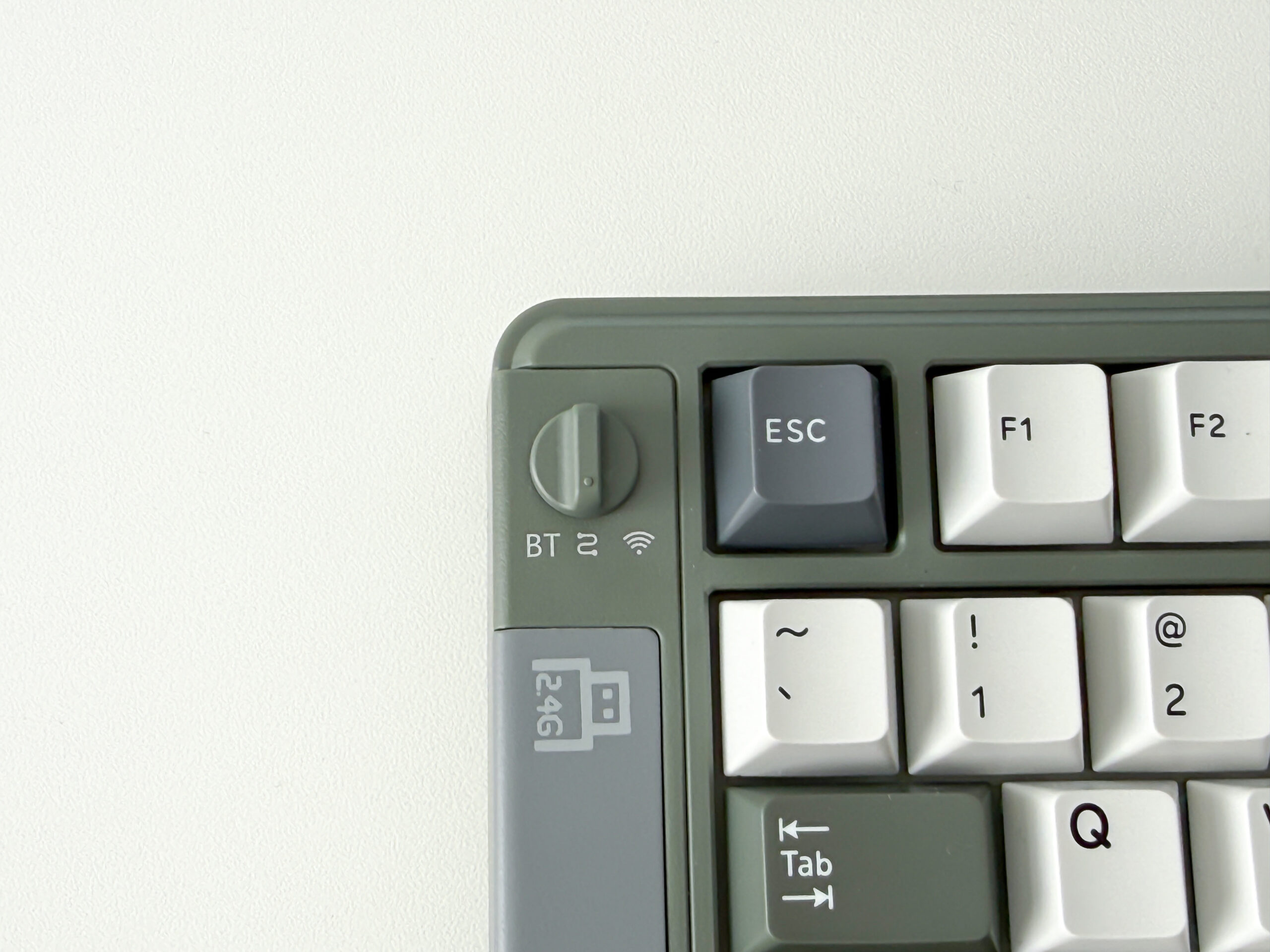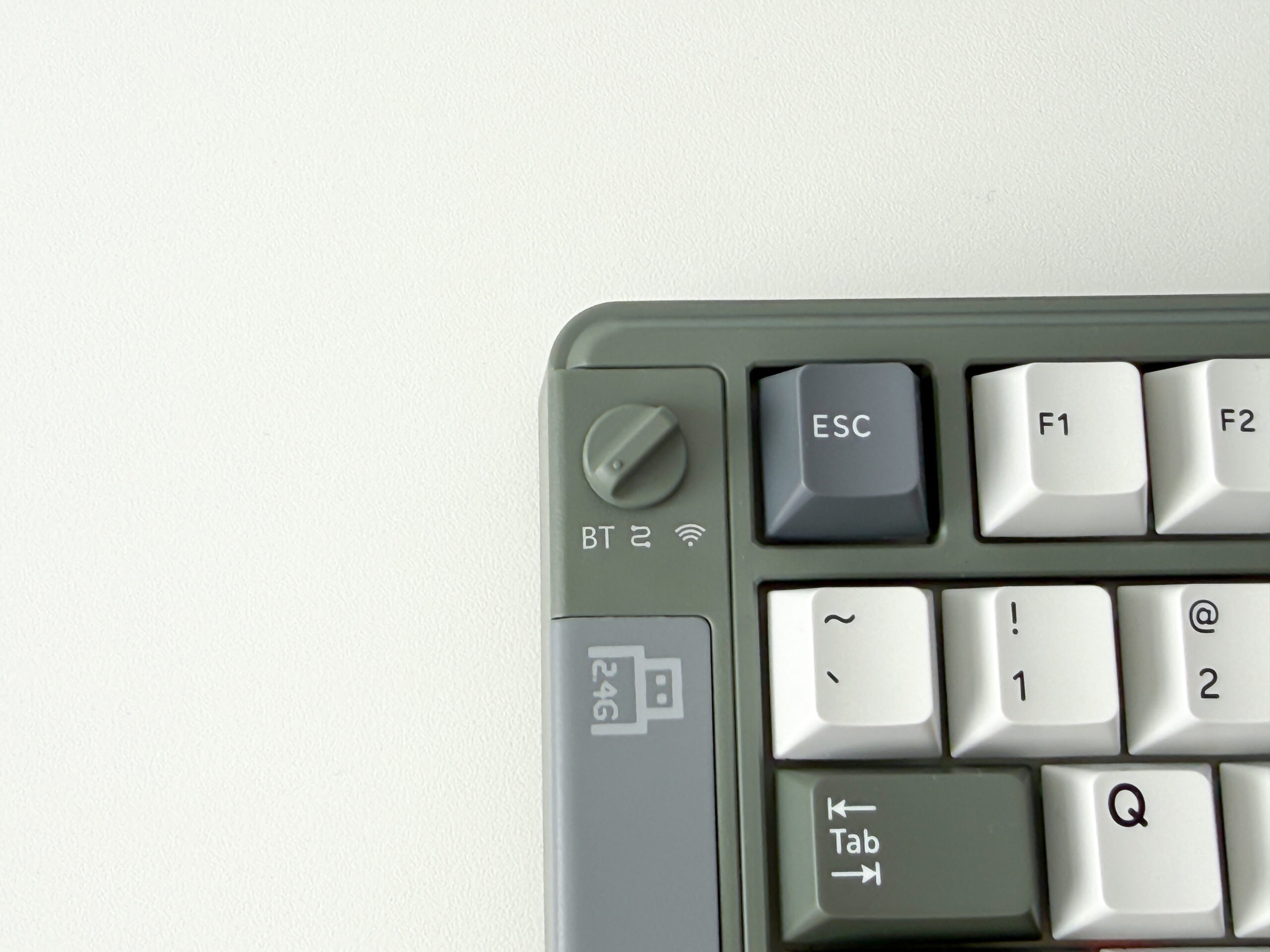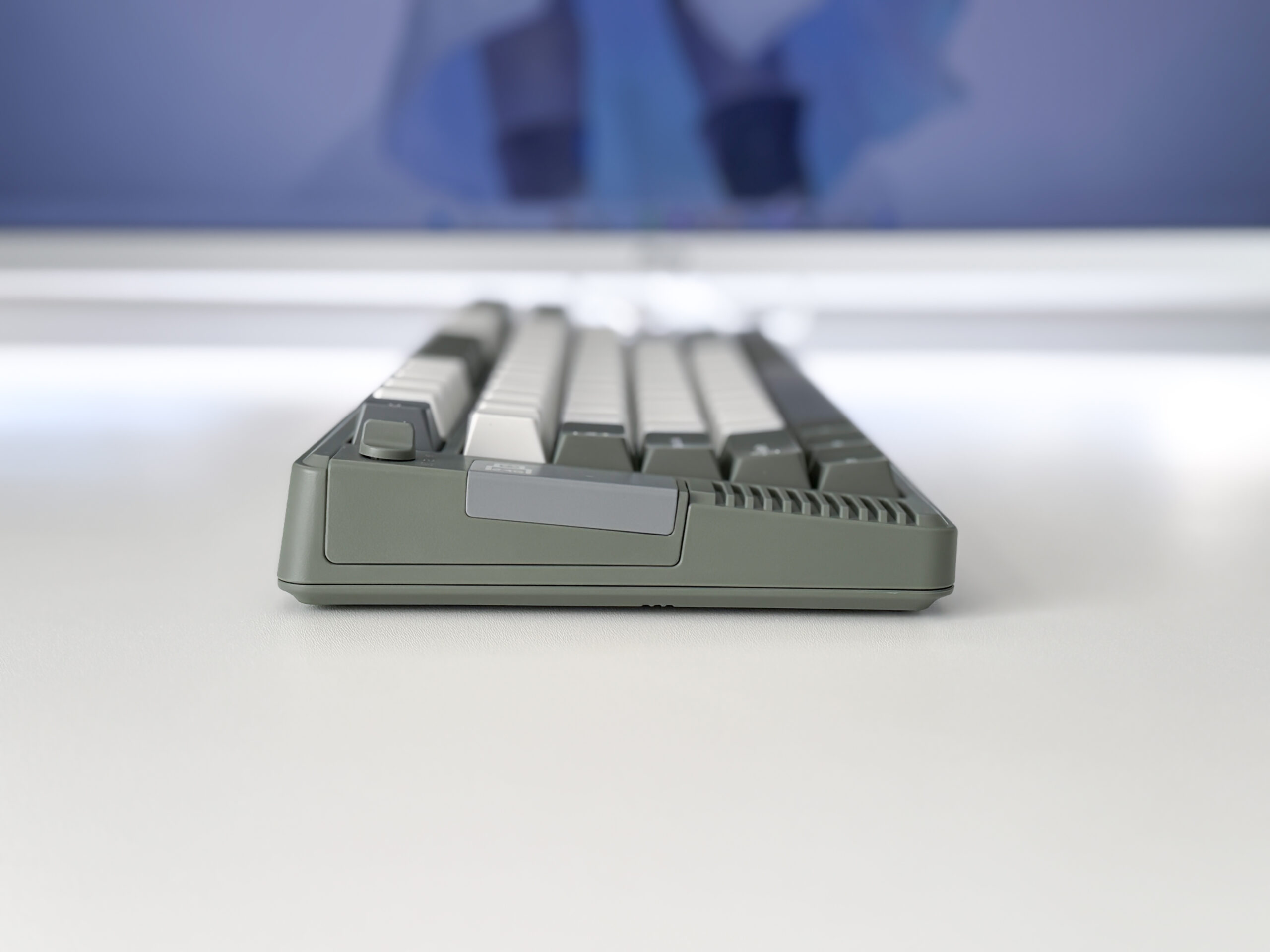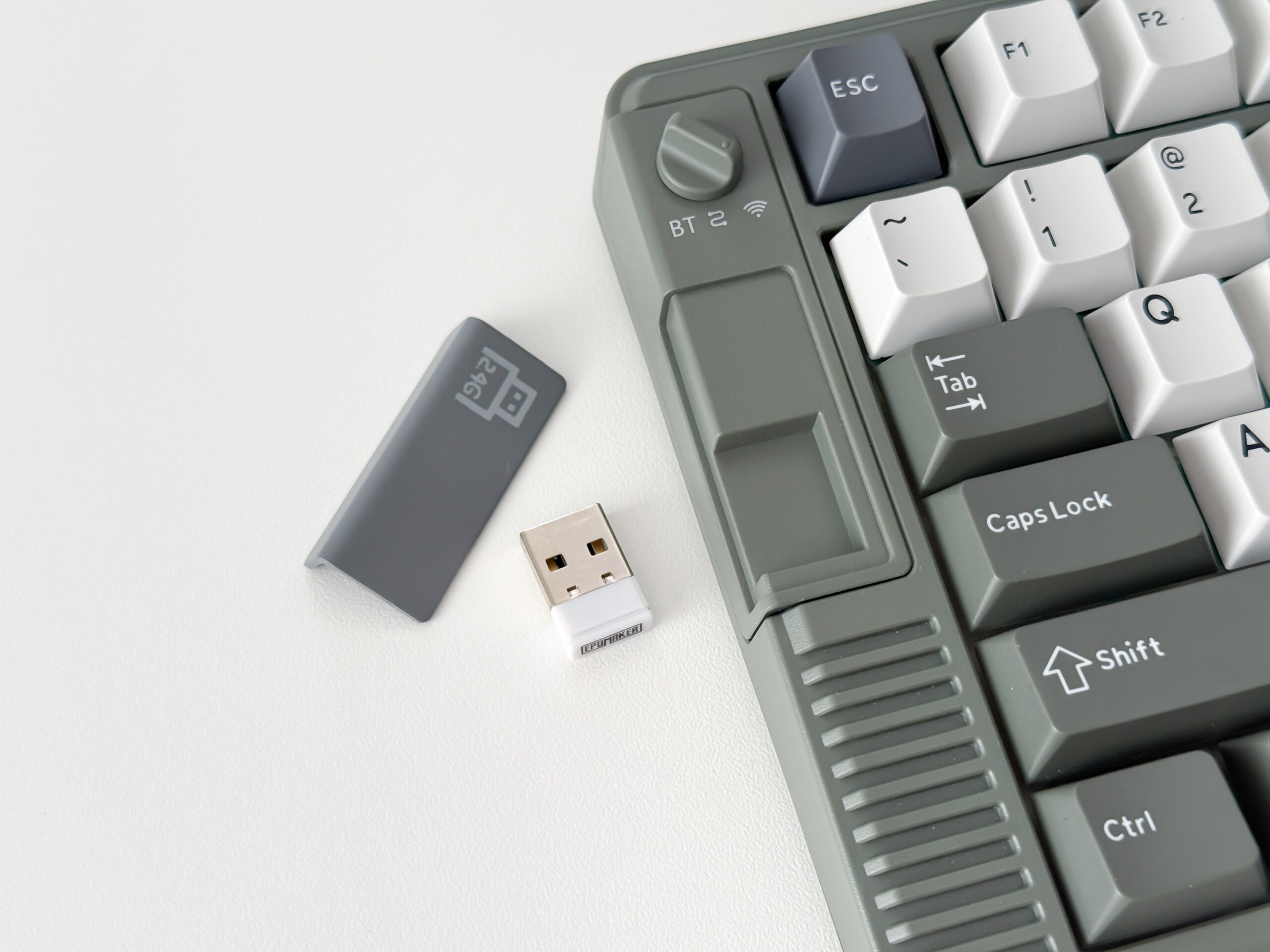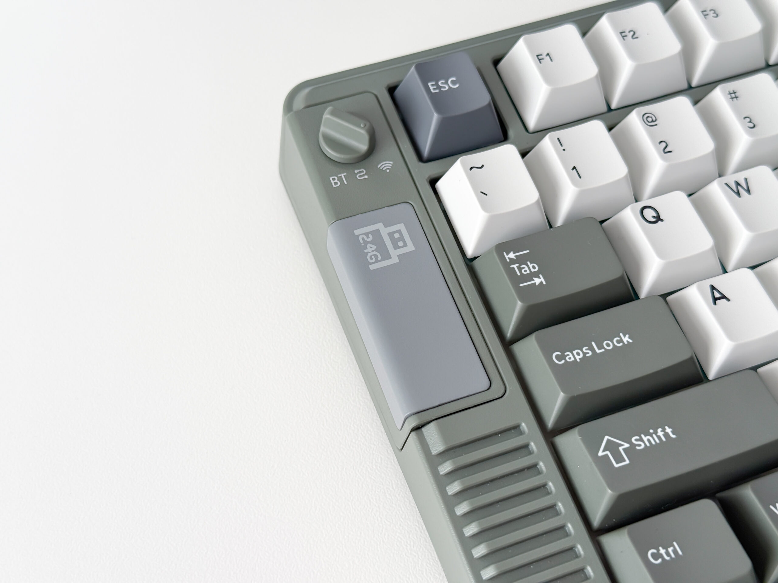 EPOMAKER RT85は、レトロなデザインが特徴の75%キーボードです。右側端にはディスプレイジョイスティックを搭載し、左端には、接続方式の切り替えスイッチと、磁石式のカバーの下にUSBレシーバーが格納されています。